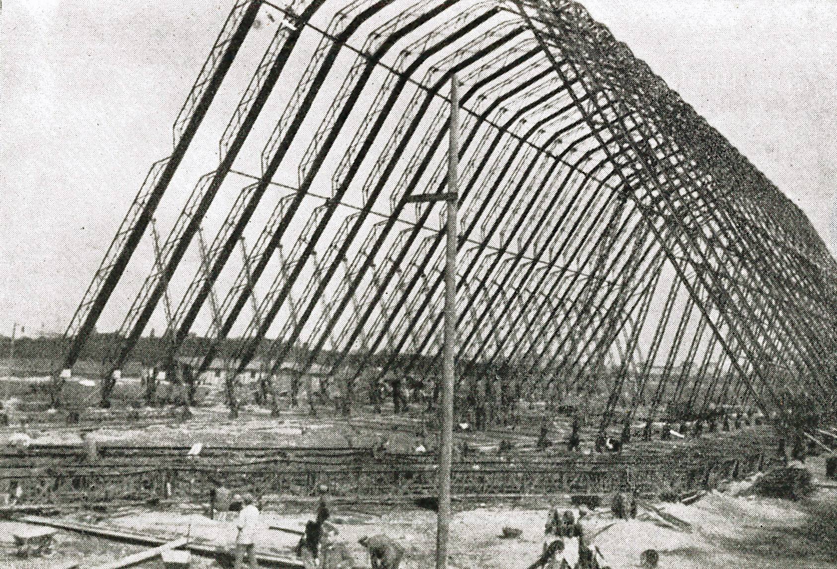 På 6 Uger byggede vi – ca. 630 Mand – en Hal, der var 145 m lang, 52 m bred og 45 m høj. Men det var også et Slid og Slæb fra om Morgenen Kl. 4 til 8-9 om Aftenen.