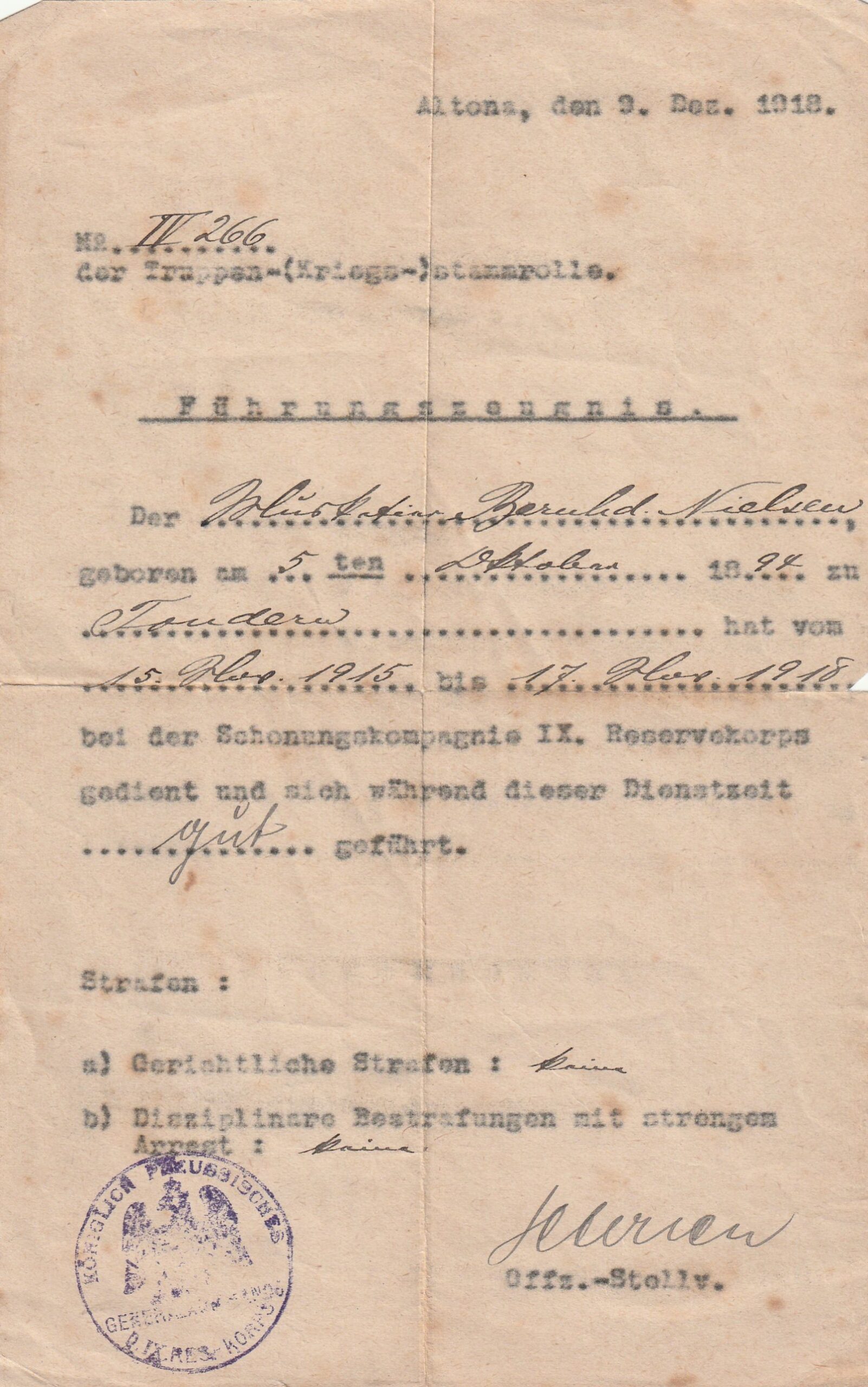 Führungszeugnis for Bernhard Mathias Peter Nielsen (1894-1976). Original på Sønderborg Slot.