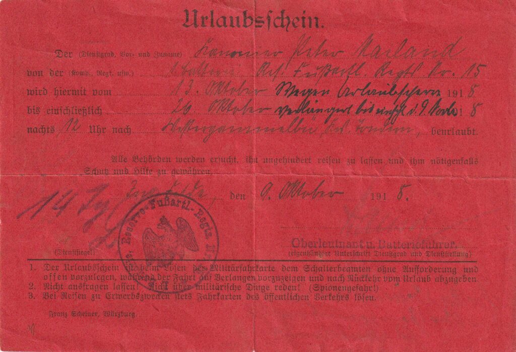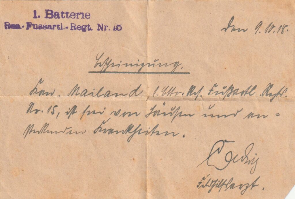 Denne uges udfordring er en attest og “Urlaubsschein” fra oktober 1918 for Peter Elias Mailand (1898-1976). Original findes på Sønderborg Slot.