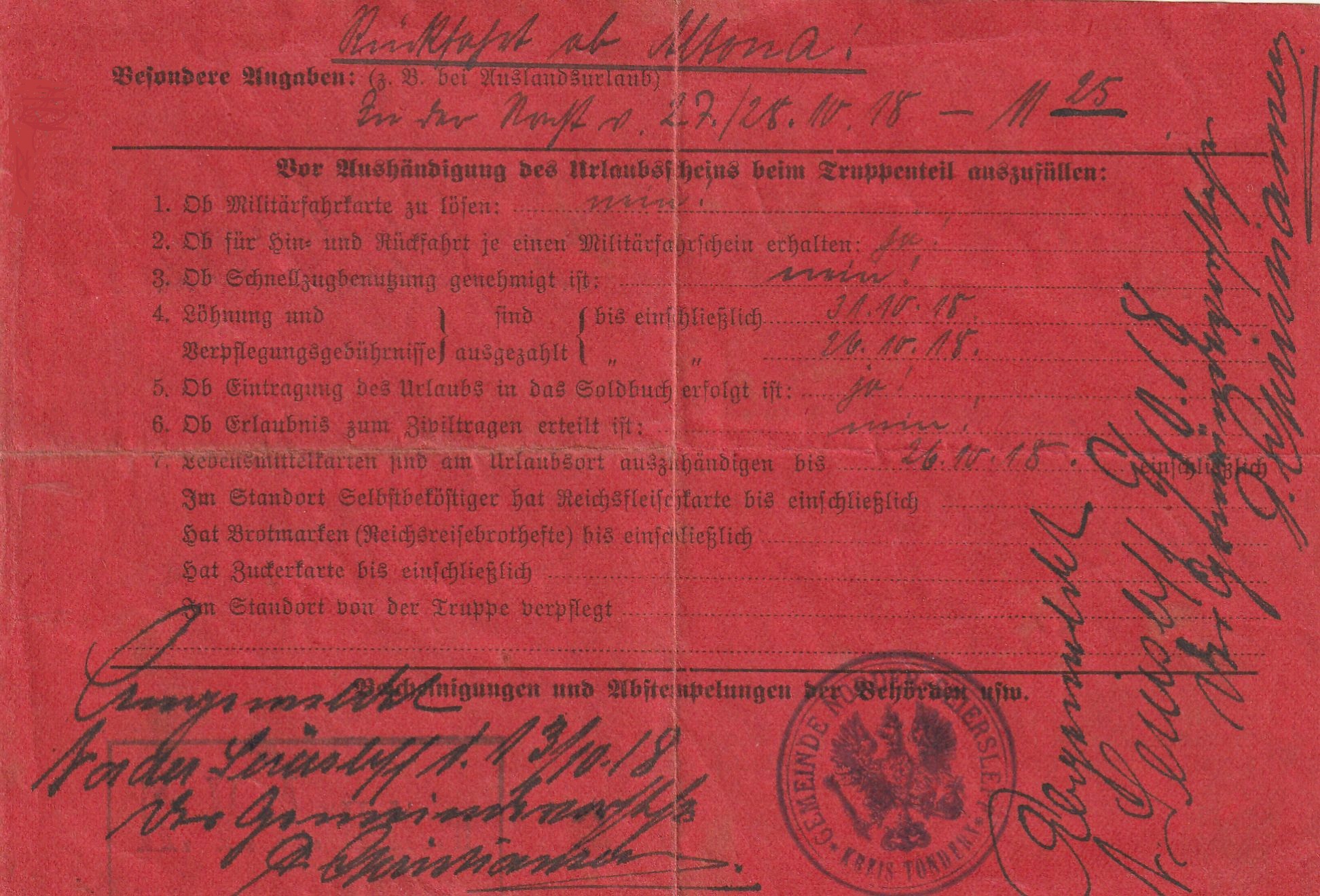 På bagsiden af Urlaubsschein læser jeg i 3. sidste linje efter Angemeldet “Norder Seiersleff d. 13/10. 18”,