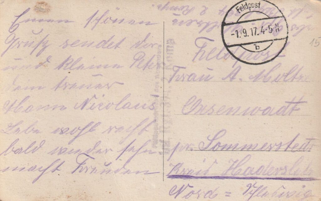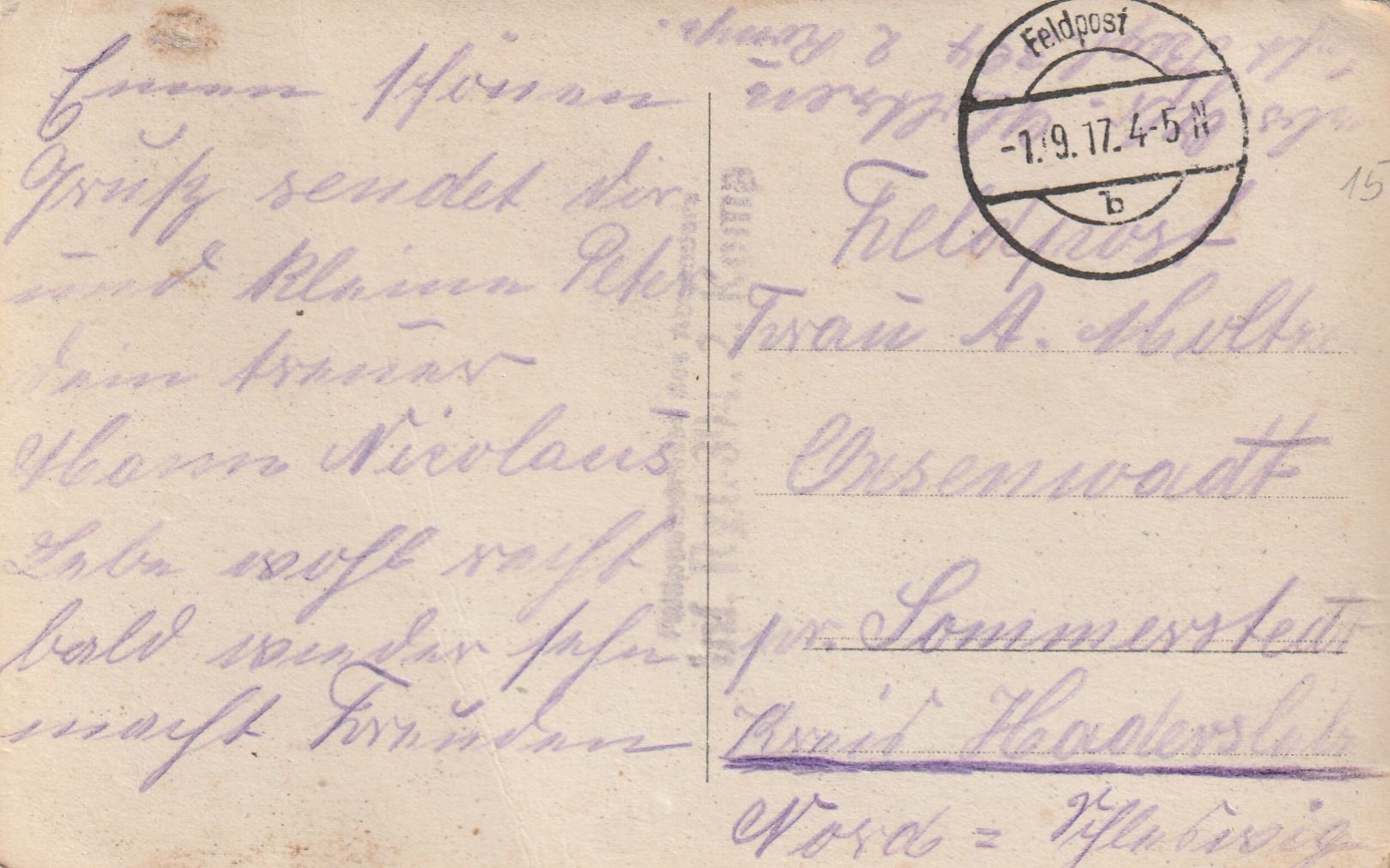 Denne uges udfordring er et postkort skrevet september 1917 af Thomas Nicolaus Moltzen (født 1882) til hustruen i Oksenvad sogn. Original på Sønderborg Slot.