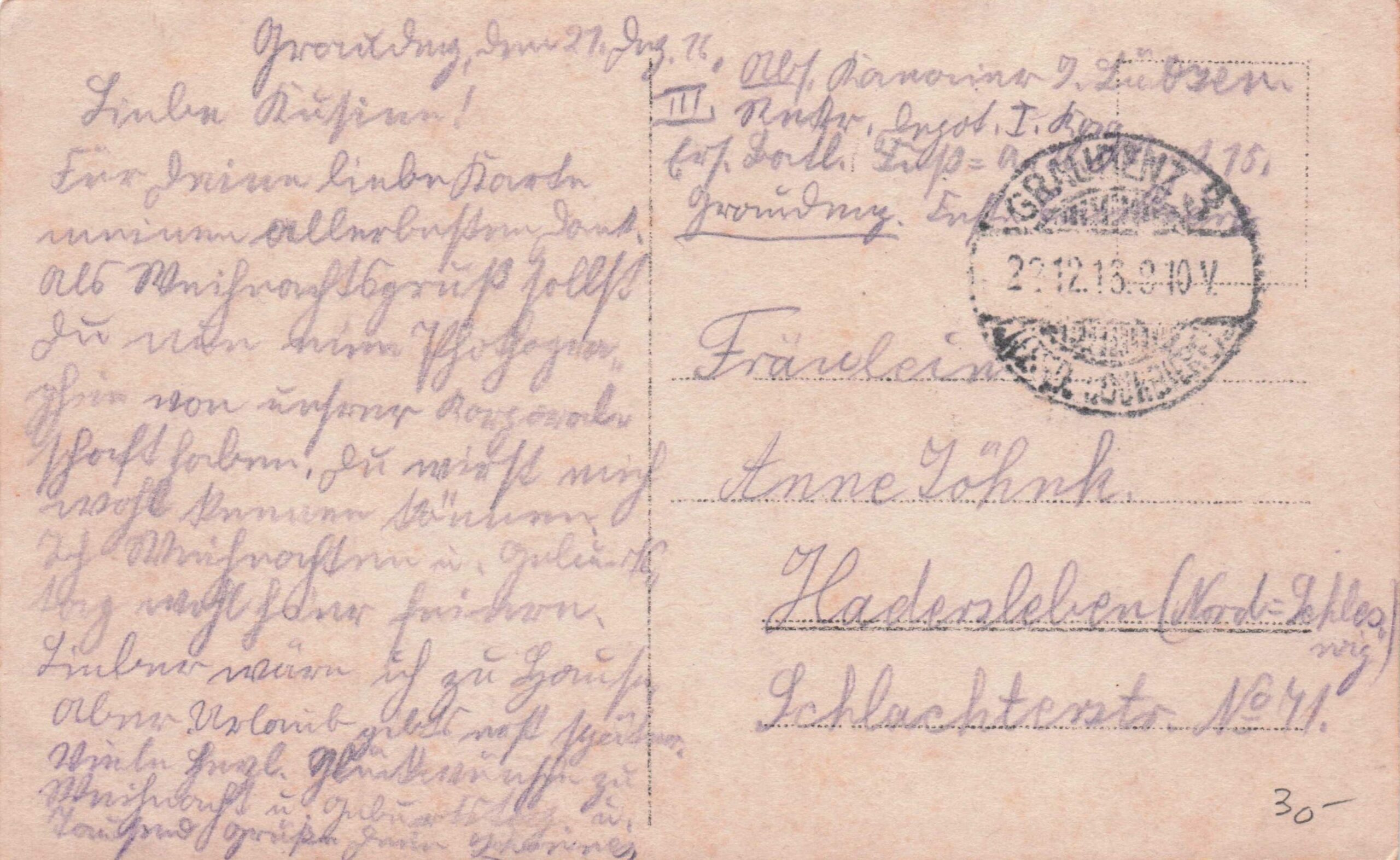 Denne uges udfordring er et postkort skrevet 21. december 1916 af Johannes Lützen til kusinen Anne Marie Jöhnk (født 1903) i Haderslev. Anne Marie Jöhnk er søster til Friedrich Heinrich Jöhnk (1893-1976). Original i privateje 2026.
