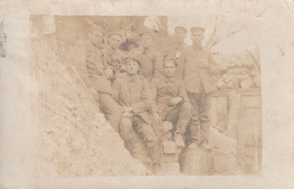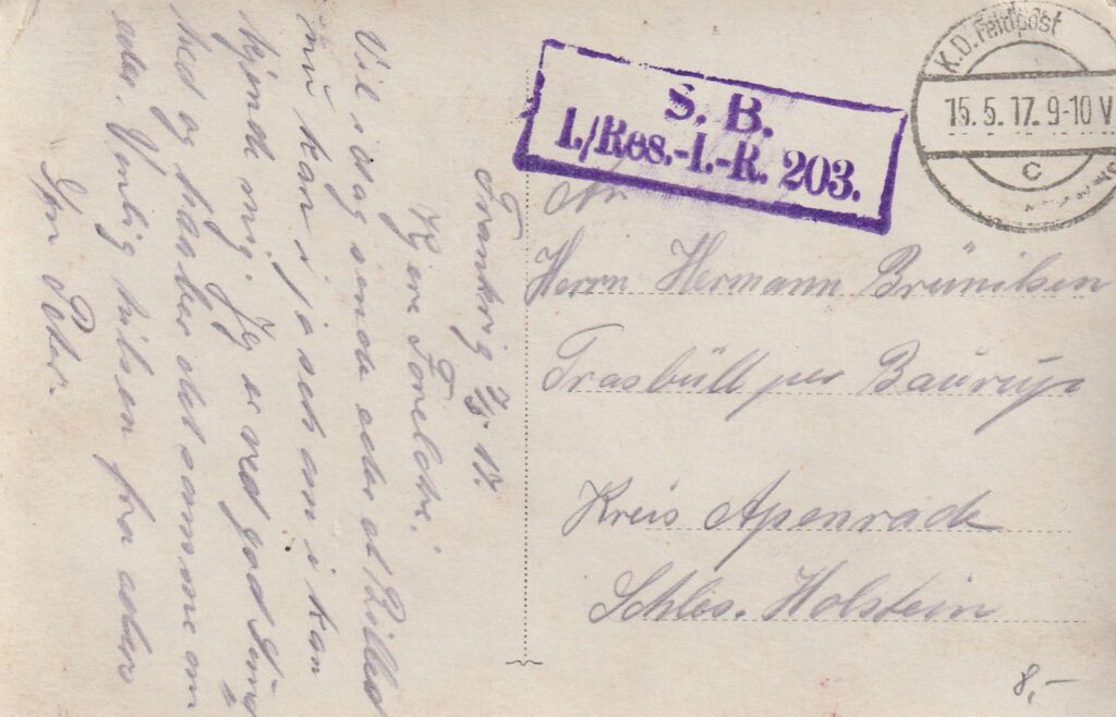 Denne uges udfordring er et postkort med et gruppefoto. Postkortet er stemplet den 15, maj 1917 og er skrevet af Peter Brünilsen (1893-1974) til forældrene, der da var bosat i Traasbøl, Felsted sogn. Original på Sønderborg Slot.