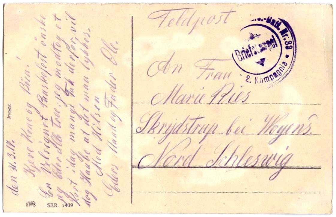 Kommentar: Teksten på det kun delvist læselige “Briefstempel” tyder jeg som om han i marts 1917 har tilhørt 2. Kompagnie/Ersatz-Bataillon /Landwehr-Infanterie-Regiment Nr. 83