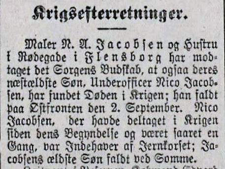 Opført i ”Verlustlisten” (dateret 29/09-1917) under navnet ”Jacobsen, Nicolaus”, der er faldet