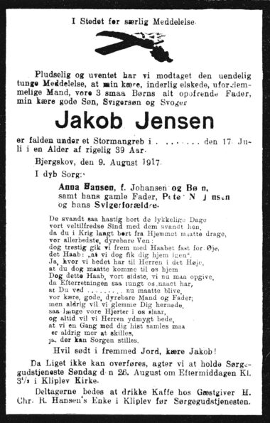 Jakob Jensen fra Bjergskov ved Kliplev er den 17. juli falden under et stormangreb, 39 aar gl.; han efterlader sig sin gamle fader samt hustru og 3 smaa børn.