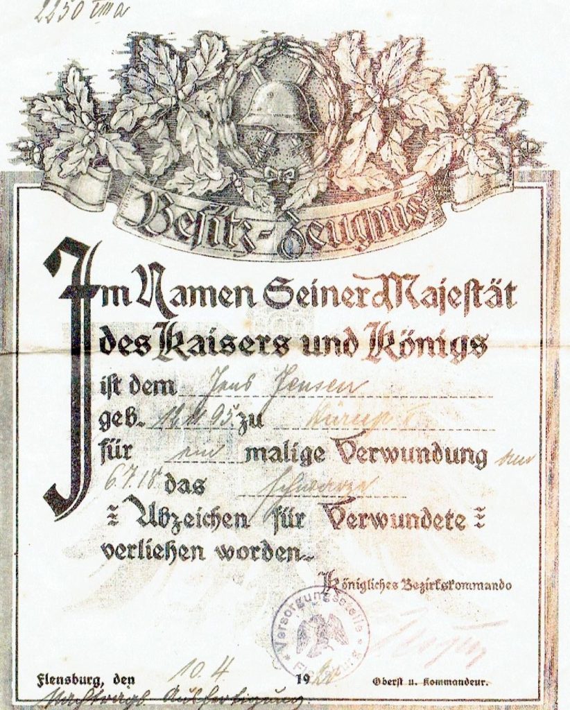 Den 23.05.1916 var Jens Jensen med i slaget ved Givenchy. Her blev han såret af en shrapnelkugle. Han var meget tæt på døden, men overlevede mirakuløst. Han havde mistet det højre øje og havde fået mange granatsplinter i underkæben. Jens Jensen var på 6 forskellige lazaretter. Det sidste var et reservelazaret i Altona, hvor han var færdigbehandlet den 08.06. 1917.
