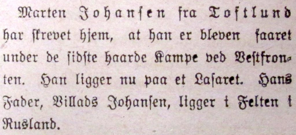 I april 1918 skrev Martin Johannsen hjem til sin mor i Toftlund, at han var blevet såret ved de seneste hårde kampe på Vestfronten. Han lå derfor på lazaret.