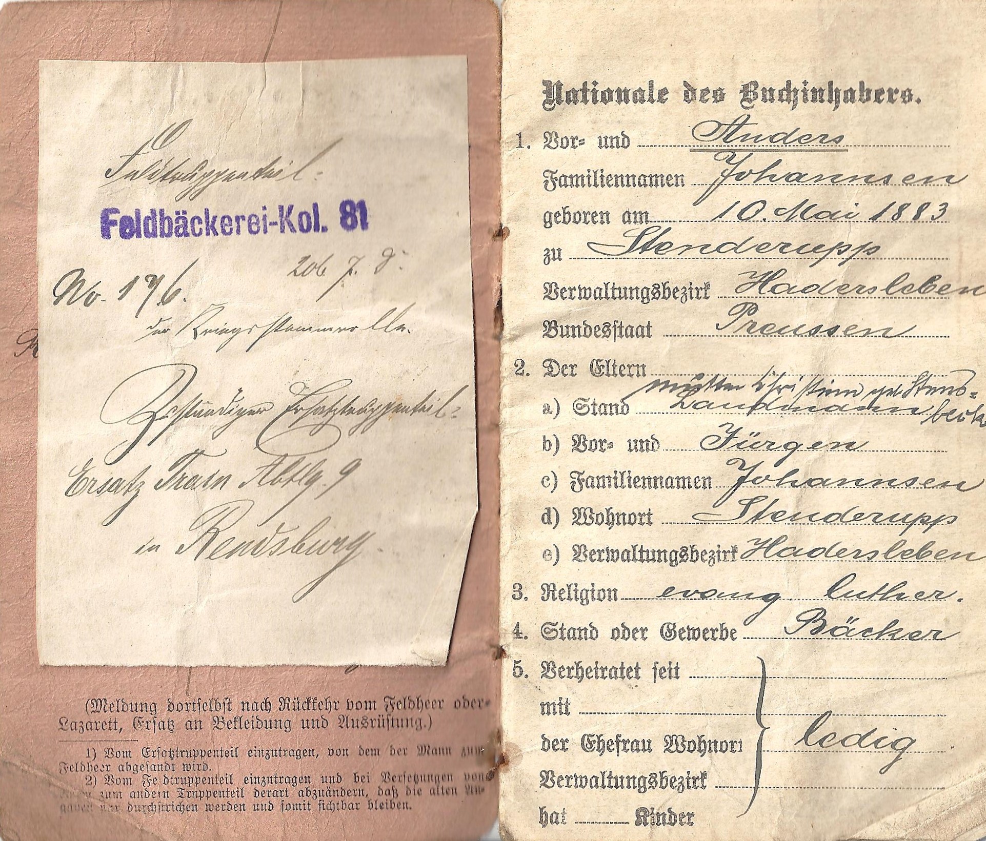 Enhed(er): Infanterie-Regiment „Hamburg“ (2. Hanseatisches) Nr. 76, 4. Kompagnie, Ersatz Train Abteilung Nr. 9, Ersatz Reserve Regiment Nr. 4, Feldbäckerei Kolonne Nr. 81