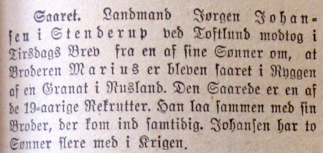 Somme tider fik forældrene besked om, hvad der var sket med deres sønner ved, at de skrev hjem om hinanden. Den 25. maj 1916 skriver Marius Johansen hjem til forældrene i Stenderup, at han har erfaret at broderen Michael er kommet i russisk fangenskab.
