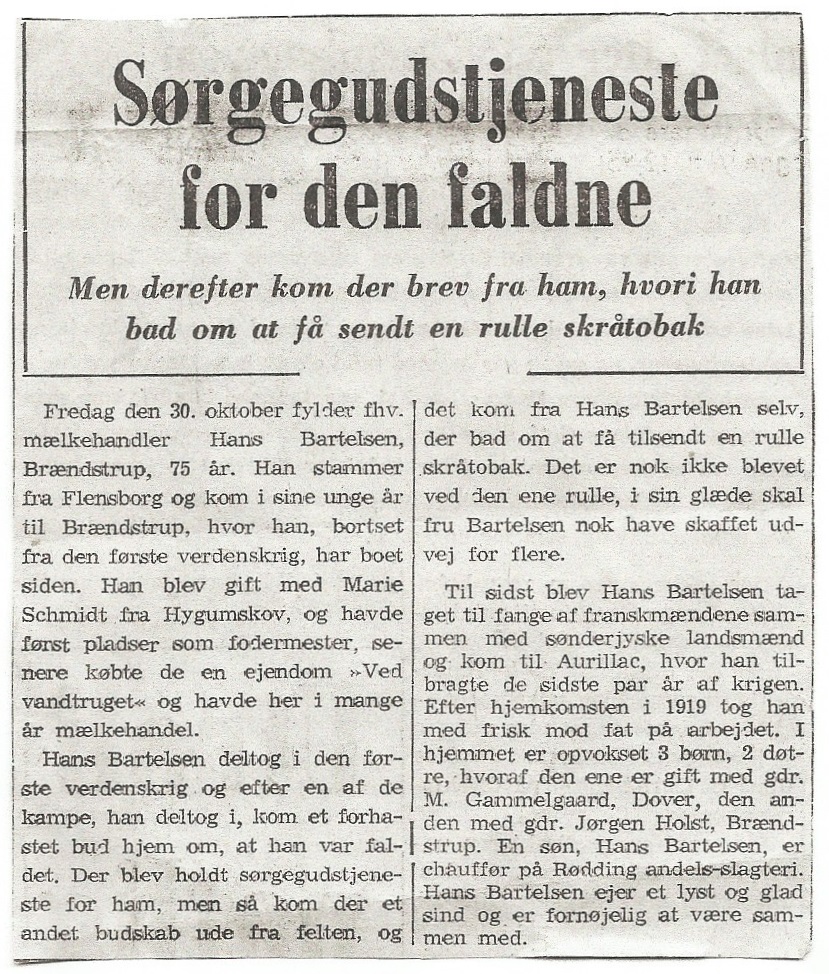 Andet: Der blev 22/10-1915 sendt et brev til familien med budskabet om, at Hans Bartelsen var faldet den 21/10-1915. Der blev afholdt sørgegudstjeneste for ham i Rødding kirke.