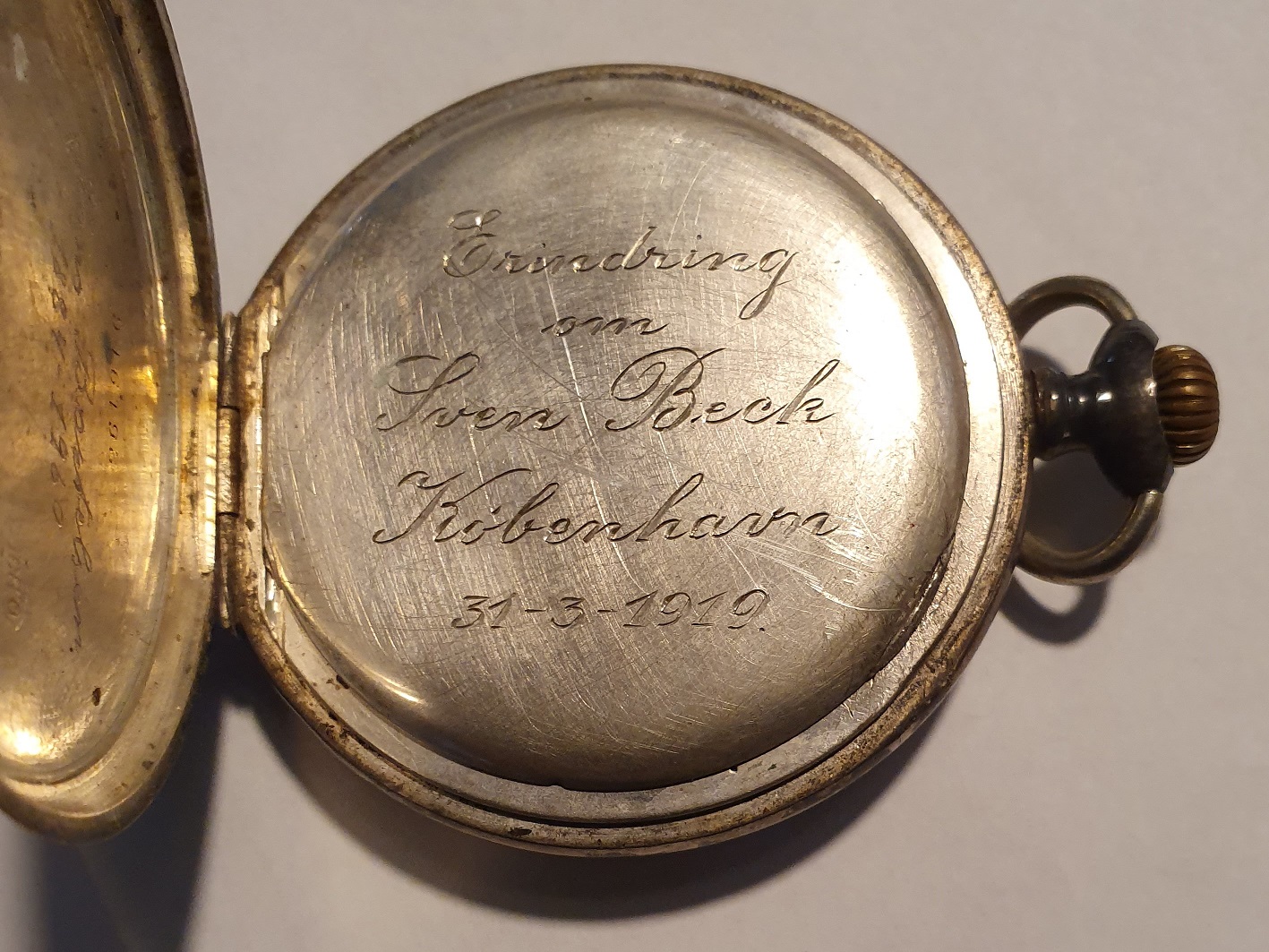 Han fik et lommeur som erindring af Sven Beck København, der står indgraveret på lommeuret, den 31/3 1919.”