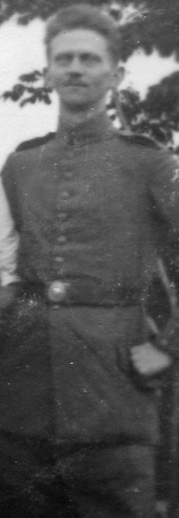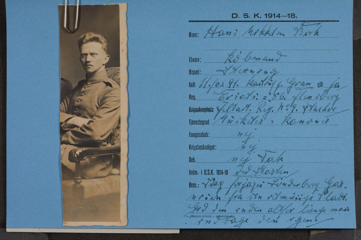 På det andet billede ses Hans Bork som soldat. (Billede øverst) Han blev indkaldt til krigstjeneste den 12. august 1914 til Flensborg, men senere (18. sept.) kommer der til at stå i hans militærpas, at han ikke er egnet til krigstjeneste, men får andre opgaver bag fronten.
