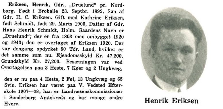 Henrik Eriksen var 1943 Landvæsenskommissionær i Sønderborg Amtskreds og bestred mange andre hverv.