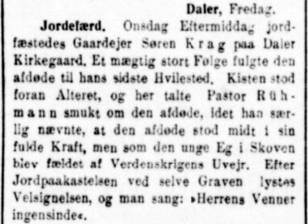 Søren W. Krag døde ifølge indførslen i Daler kirkebog af en blodsygdom, der skyldtes gasforgiftning under 1. verdenskrig.