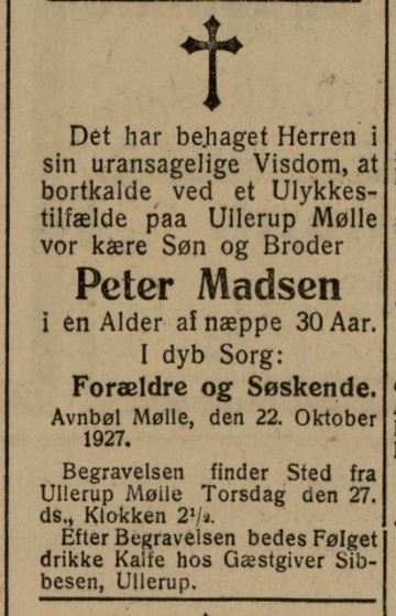 Peter Madsen havde overtaget Ullerup Mølle, da han i oktober 1927 omkom ved en ulykke i møllen.