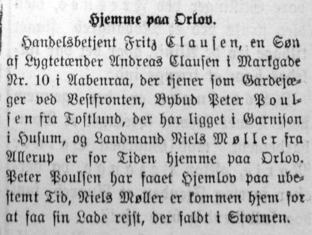 Omkring 1. marts 1916 fik Niels Møller orlov, fordi der havde været en orkanagtig storm fra sydvest over Toftlund-egnen. Mange af egnens bygninger blev skadet, således også Niels Møllers staldbygning. Han søgte orlov for at komme hjem og genrejse bygningen.