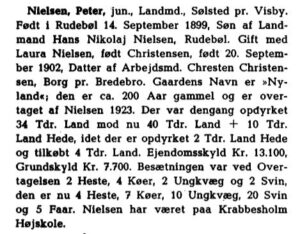 Overtog 1923 gården ”Nyland” i Sølsted, Abild sogn, med 34 Tdr. Land. I 1944 var der 40 Tdr. land og 10 Tdr. land hede til gården.
