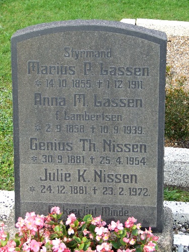 Andet: Søn af Skibsfører Peter Laurids Nissen og hustru Cathrine Marie f. Bleeg, Rømø