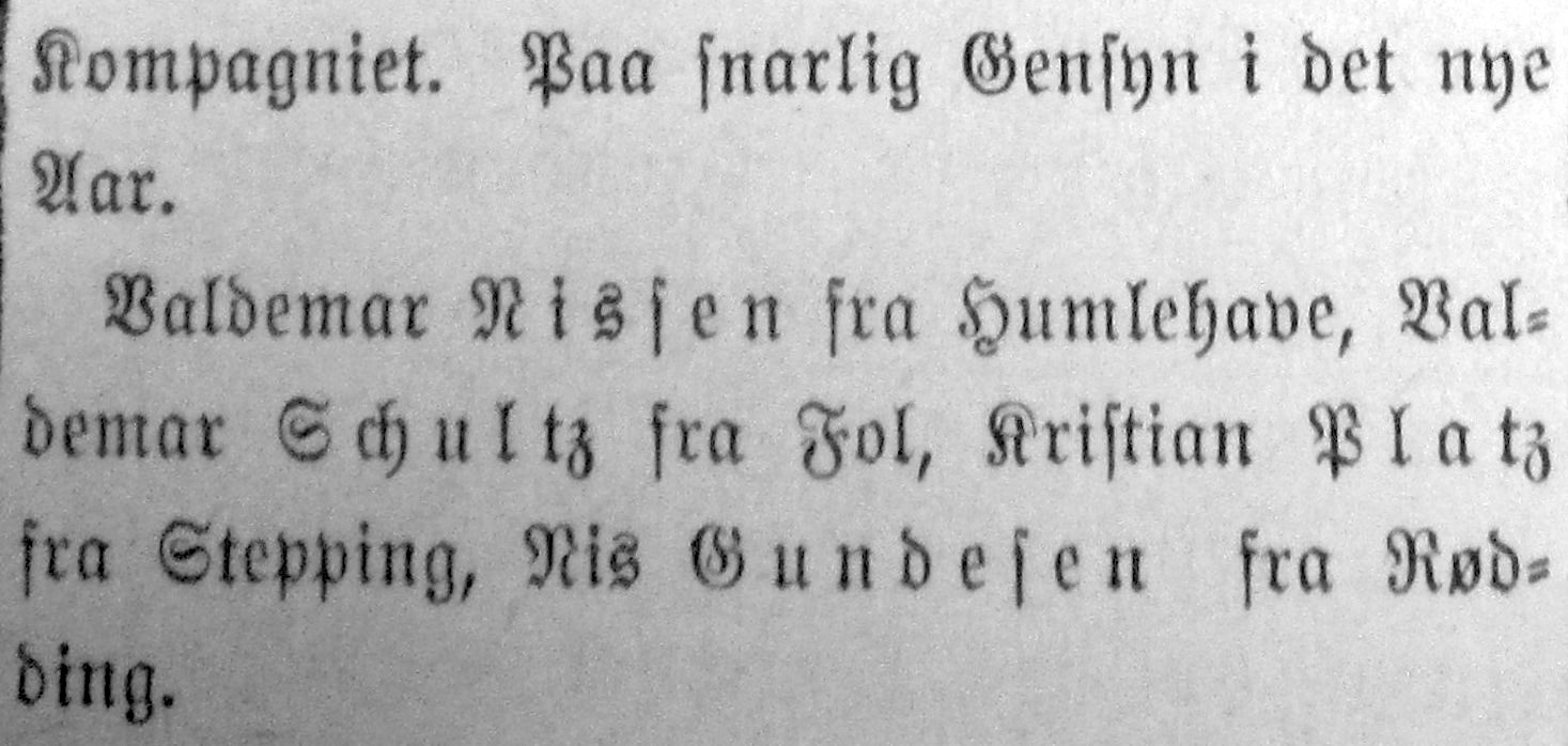 ”Kære Hejmdal! For anden gang sender vi Dig en Hilsen med Tak, fordi Du besøger os hver Dag. Vi beder Dig nu bringe alle Venner og Bekendte hjemme vore Hilsener og Ønsker om et velsignet og fredbringende Nytaar. Vi er sunde og raske, men kan ikke rigtig gøre os fortrolige med Tanken om at skulle holde Jul i Skyttegravene. Vi haaber ogsaa i det nye Aar at faa Dit Besøg hver Dag med Hilsener hjemmefra”