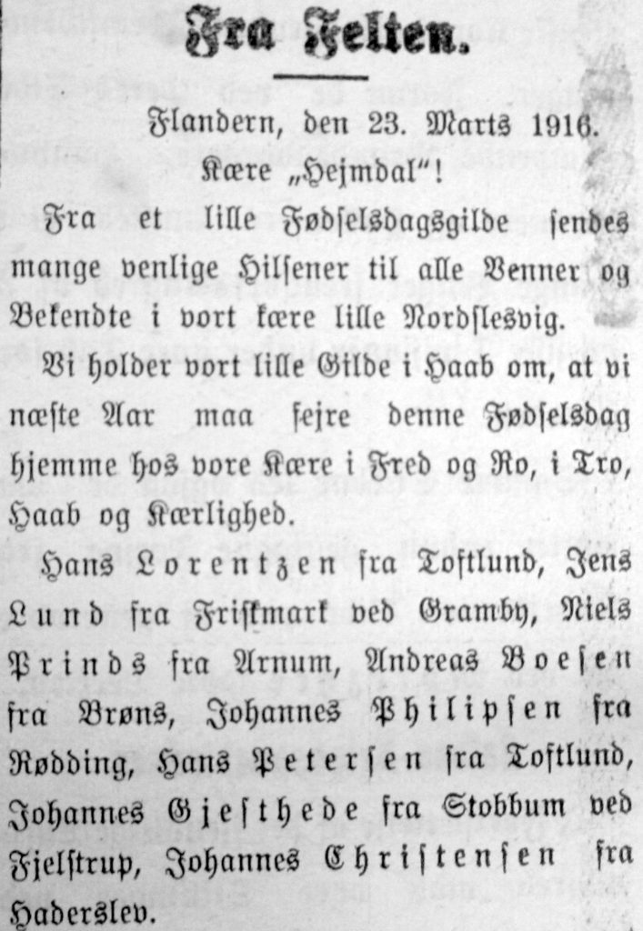 Den 28.03.1916 sender Hans Petersen en hilsen hjem fra Flandern. En gruppe soldater holder et lille fødselsdagsgilde og benytter lejligheden til at sende en hilsen til venner og bekendte.