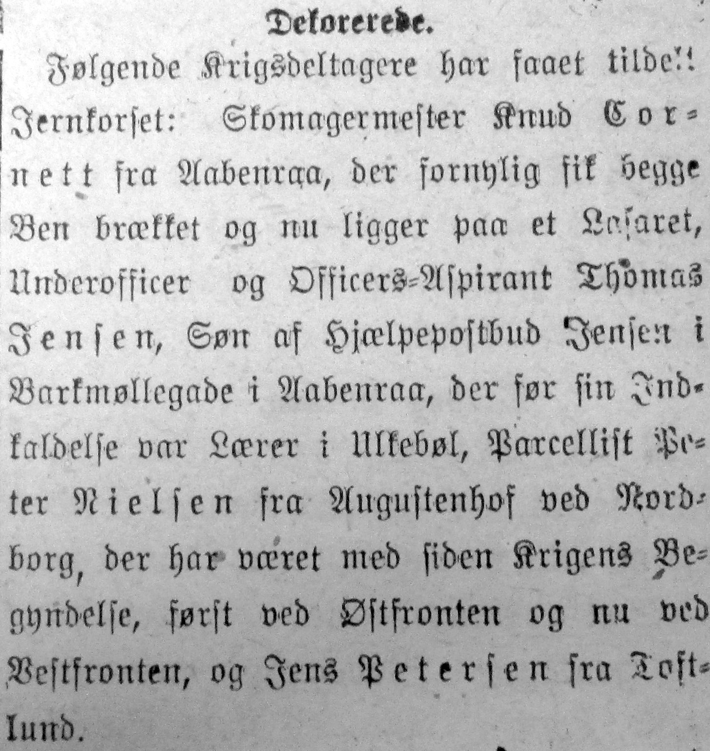 Jens Peter Petersen deltog i krigen fra 1915-1918. Den 27.08.1918 meddeles det i Hejmdal, at han har modtaget Jernkorset II Klasse.