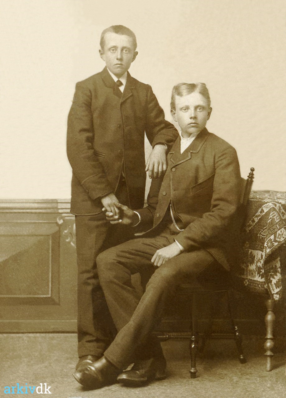 Stående Carl Petersen, født den 25. juli 1877 søn af gårdmand Andreas Petersen og Anne Cathrine, født Hansen, og siddende broderen Jørgen Carl Petersen, født den 24. januar 1875.