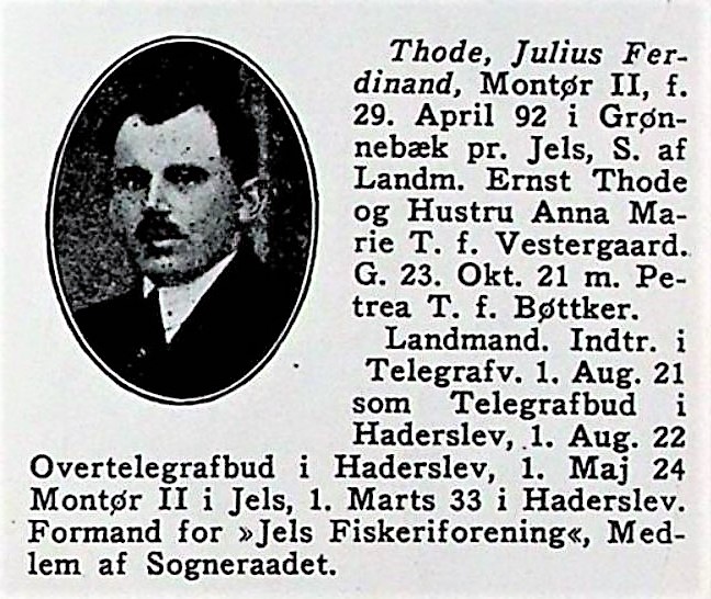 ”Døde”, Sønderjyden (Sønderborg), 18/04-1972. Afskrift: ”Pensioneret overmontør Julius F. Thode, Ny Allégade 16, Haderslev, er død.”.