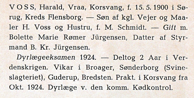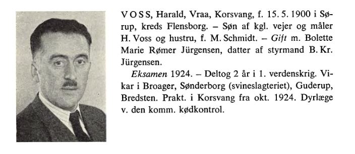 Barnebarn oplyser: ”Jeg kan finde Harald Voss i Politiets Registerblade, november 1919. Han bor da i Viktoriegade hos urmager Jens Beck og hans kone Anna Maria f. Schmidt og i Flensborg (aldersmæssigt kunne det være en søster til hans mor). 1922 flytter han til Nylandsvej. Begge steder er han opført som veterinær studerende.