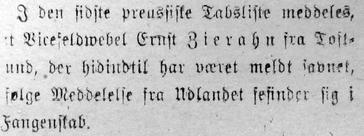 Tabslister: Zierahn, Ernst, Vzfeldw., 13.8, Toftlund, Hadersleben, 16/04-1916 vermisst, 14/08-1918 bisher vermisst, in Gefangenschaft (A.N.)
