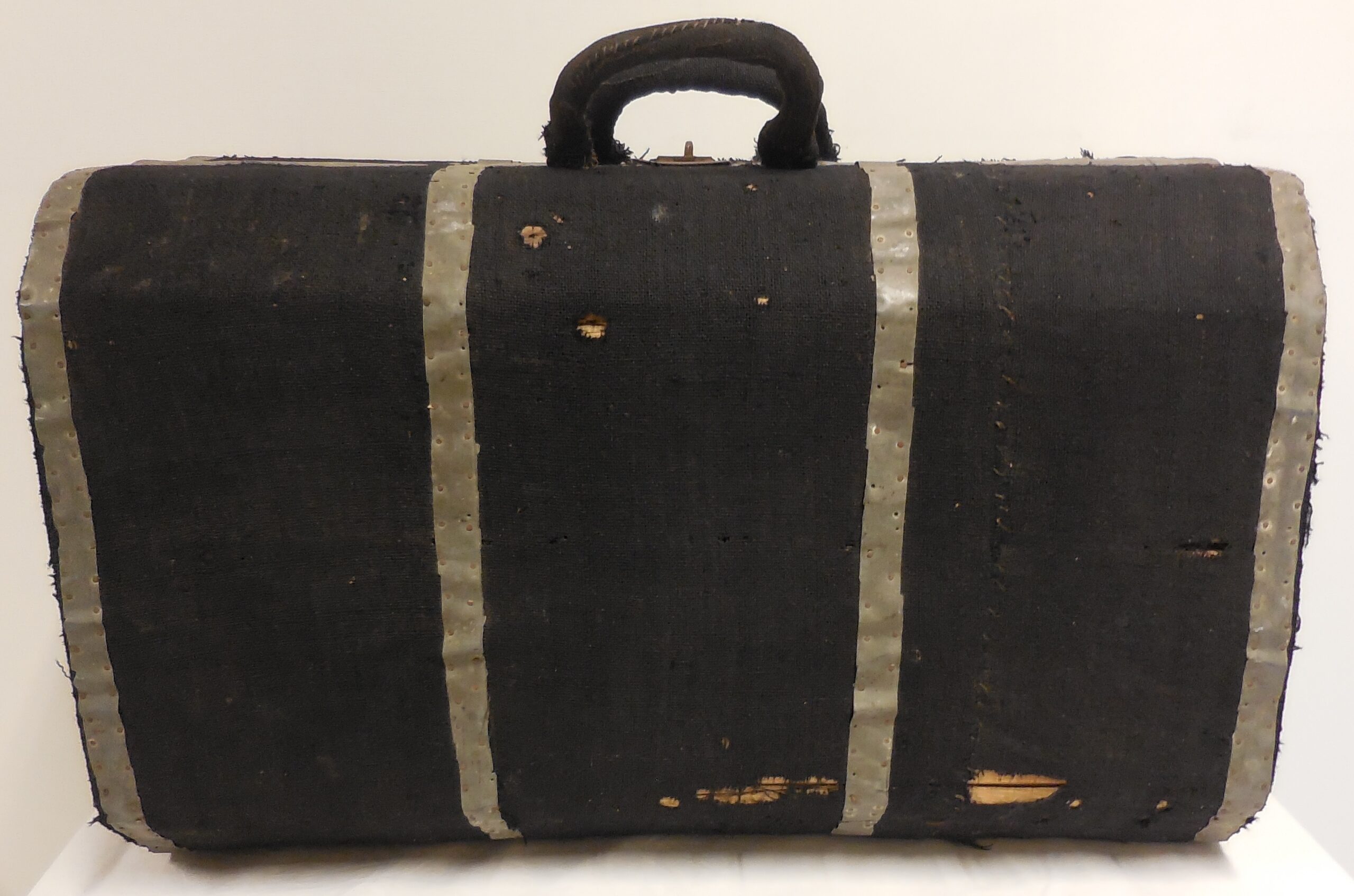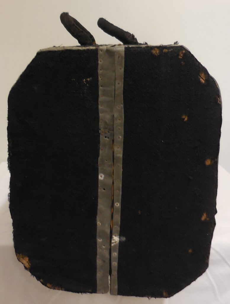 Kuffertens profil er 8-kantet. Den er lavet af træ. Indvendig er lavet et lille ekstra rum med et hemmeligt rum i. Indersiden er beklædt med slidt papir. Ydersiden og de 2 håndtag er beklædt med sort stof, som er fastgjort med søm i ujævnt udskårne strimler af zinkplader.