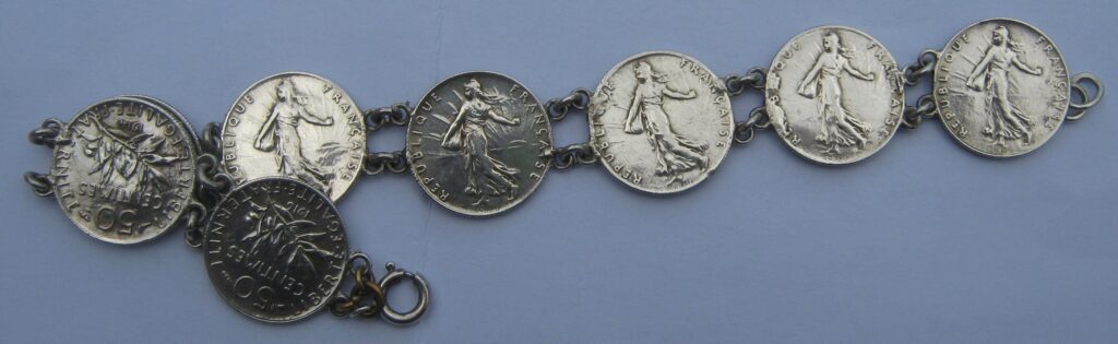 Dette indlæg i Julekalenderen 2025 viser et 20 cm. langt armbånd lavet af otte franske sølvmønter: 50 Centimes. Hver mønt måler 1,8 cm. i diameter. I mellemrummene mellem mønterne er der loddet to øjer over hinanden på hver mønt. Mønterne er samlet med en sølvring igennem de to øjer på den næste mønt.