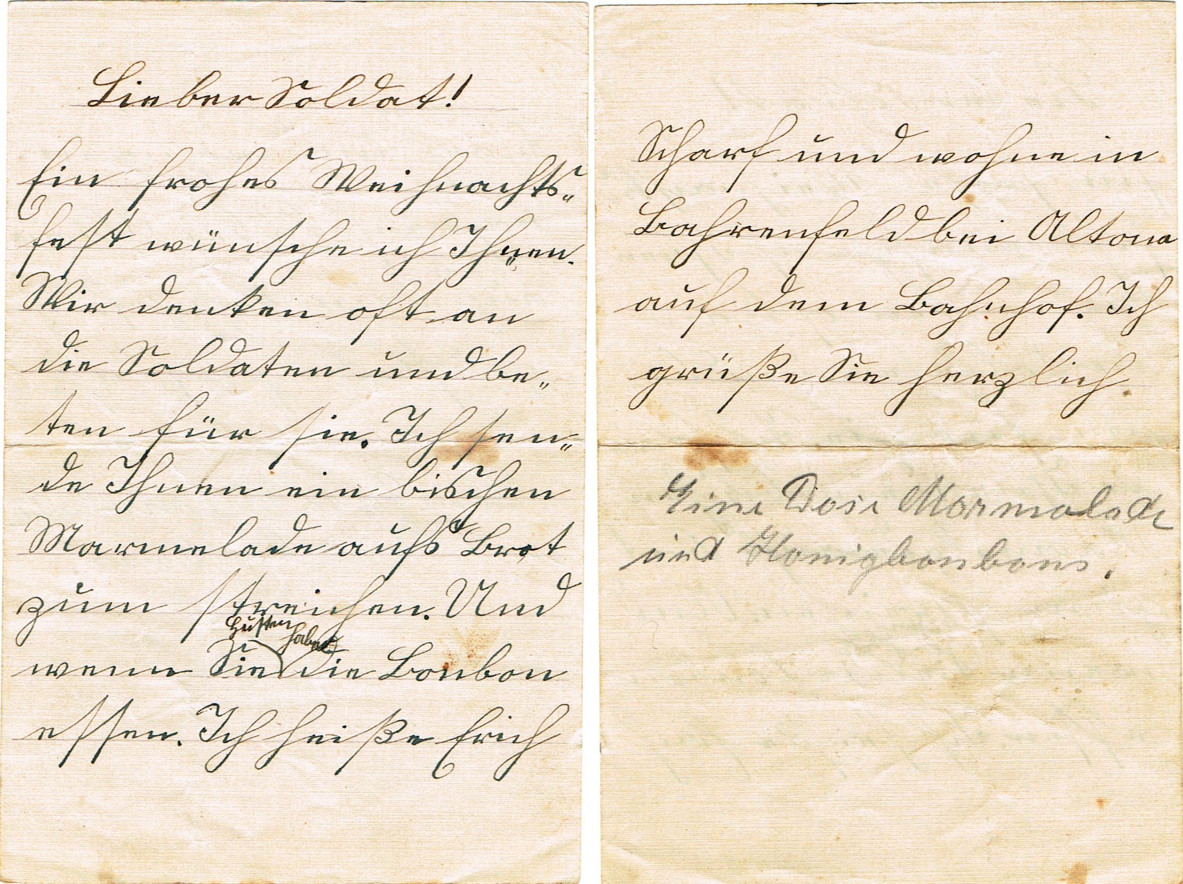 Det regner og blæser, et rigtig stygt Vejr, derhjemme sagde man altid: „det er itt’ et Vær aa jav en Hund uer i“. Da aabnes den meterhøje Dør til vor romantiske Bolig, og en dump Krigerstemme brummer: „Nachtposten fertig machen, in 5 Minutten raustreten!“ Det behager os naturligvis ikke, men her nytter ingen kære Mor.
